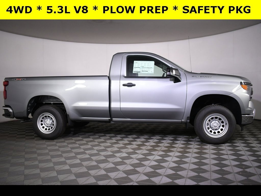 Sterling Gray Metallic 2025 Chevrolet Silverado 1500 WT 4WD 8-Speed Automatic EcoTec3 5.3L V8 All Wheel Drive, ** Apple CarPlay/Android Auto, ** Alloy Wheels / Premium Wheels, ** Automatic Emergency Braking, ** Backup Camera, ** Blind Spot Monitor, ** Cross Traffic Alert, ** Cruise Control, ** Keyless Entry, ** Lane Departure Warning, ** Premium Sound System / Premium Audio, ** Rear Cross Traffic Alert, ** Satellite Radio, ** Stability Control, ** Steering Wheel Controls, ** Tow Hitch / Trailer Hitch, ** USB Port, ** WiFi Hotspot, ** All-Wheel Drive, ** Four-Wheel Drive / 4X4, 120-Volt Bed Mounted Power Outlet, 120-Volt Interior Power Outlet, 2-Speaker Audio System, 220 Amp Alternator, 3.5 Monochromatic Display Driver Info Center, 4-Way Manual Driver Seat Adjuster, 4-Wheel Disc Brakes, 40/20/40 Front Split Bench Seat, ABS brakes, Air Conditioning, All-Weather Floor Liner (LPO), Apple CarPlay/Android Auto, Auto High-beam Headlights, Auto-Locking Rear Differential, Automatic Emergency Braking, Auxiliary External Transmission Oil Cooler, Bluetooth® For Phone, Brake assist, Chevytec Spray-On Black Bedliner, Color-Keyed Carpeting Floor Covering, Compass, Deep-Tinted Glass, Delay-off headlights, Dual front impact airbags, Dual front side impact airbags, Electric Rear-Window Defogger, Electronic Cruise Control, Electronic Stability Control, Emergency communication system: OnStar, Following Distance Indicator, Forward Collision Alert, Front Center Armrest w/Storage, Front Chrome Bumper, Front Frame-Mounted Black Recovery Hooks, Front Pedestrian Braking, Front reading lights, Front Rubberized Vinyl Floor Mats, Front wheel independent suspension, Fully automatic headlights, HD Rear Vision Camera, Heated Power-Adjustable Outside Mirrors, Heavy-Duty Air Filter, High Gloss Black Mirror Caps, Hitch Guidance, Illuminated entry, Inside Rear-View Mirror w/Tilt, Integrated Trailer Brake Controller, IntelliBeam Automatic High Beam On/Off, Lane Change Alert w/Side Blind Zone Alert, Locking Tailgate, Low tire pressure warning, Manual Tailgate Function w/No EZ Lift, Manual Tilt Wheel Steering Column, Occupant sensing airbag, OnStar Services Capable, Outside temperature display, Overhead console, Panic alarm, Passenger vanity mirror, Perimeter Lighting, Power door mirrors, Power Front Windows w/Driver Express Up/Down, Power Front Windows w/Passenger Express Down, Power windows, Preferred Equipment Group 1WT, Radio: Chevrolet Infotainment 3 System, Rear Chrome Bumper, Rear Cross Traffic Braking, Rear Pedestrian Alert, Rear reading lights, Rear step bumper, Remote Keyless Entry, Remote keyless entry, Rubberized-Vinyl Floor Covering, Snow Plow Prep Package, Solar Absorbing Tinted Glass, Speed control, Speed-sensing steering, Standard Tailgate, Tachometer, Teen Driver, Tilt steering wheel, Tire Pressure Monitoring System, Traction control, Trailering Package, Trip computer, Ultrasonic Front & Rear Park Assist, Variably intermittent wipers, Voltmeter, Wheels: 17 x 8 Ultra Silver Painted Steel, Wi-Fi Hot Spot Capable, WT Convenience Package, WT Safety Package, WT Value Package.