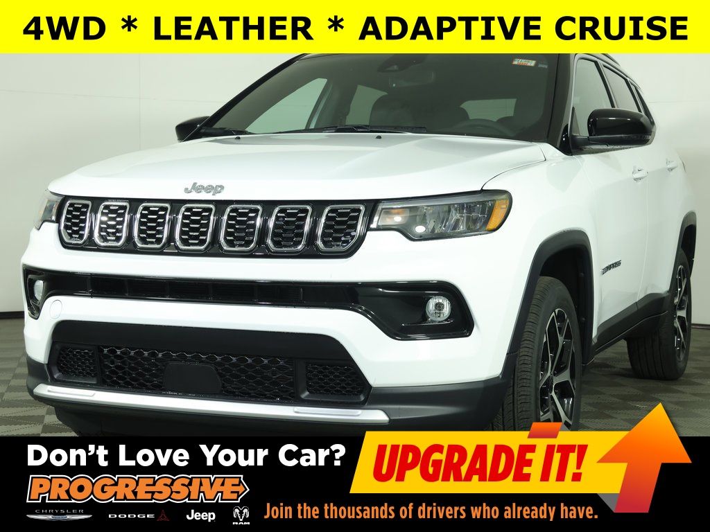 AVAILABLE PROGRESSIVE SERVICE RENTAL ** Bright White Clearcoat 2026 Jeep Compass Limited 4WD 8-Speed Automatic 2.0L I4 DOHC ** Adaptive Cruise Control, ** All-Wheel Drive, ** Alloy Wheels / Premium Wheels, ** Apple CarPlay/Android Auto, ** Automatic Emergency Braking, ** Backup Camera, ** Blind Spot Monitor, ** Cross Traffic Alert, ** Four-Wheel Drive / 4X4, ** Keyless Entry, ** Keyless Start, ** Lane Departure Warning, ** Leather Seats, ** Premium Sound System / Premium Audio, ** Rear Cross Traffic Alert, ** Remote Start, ** Satellite Radio, ** Stability Control, ** Steering Wheel Controls, ** USB Port, ** WiFi Hotspot, 10.1" Touchscreen Display, 4-Wheel Disc Brakes, 6 Speakers, ABS brakes, Air Conditioning, AM/FM radio: SiriusXM, Auto High-beam Headlights, Auto-dimming Rear-View mirror, Automatic temperature control, Brake assist, Compass, Delay-off headlights, Driver vanity mirror, Dual front impact airbags, Dual front side impact airbags, Electronic Stability Control, Four wheel independent suspension, Front Bucket Seats, Front dual zone A/C, Front fog lights, Front reading lights, Fully automatic headlights, Heated door mirrors, Heated front seats, Heated steering wheel, Illuminated entry, Knee airbag, Leather Shift Knob, Leather steering wheel, Leatherette Seats, Low tire pressure warning, Occupant sensing airbag, Outside temperature display, Overhead console, Panic alarm, ParkView Rear Back-Up Camera, Passenger vanity mirror, Power door mirrors, Power driver seat, Power Liftgate, Power windows, Quick Order Package 29G Limited, Rain sensing wipers, Rear seat center armrest, Rear window defroster, Rear window wiper, Remote keyless entry, Security system, Speed control, Split folding rear seat, Steering wheel mounted audio controls, Tachometer, Telescoping steering wheel, Tilt steering wheel, Traction control, Trip computer, Turn signal indicator mirrors, Variably intermittent wipers, Wheels: 18" x 7" Painted Diamond Cut Aluminum.