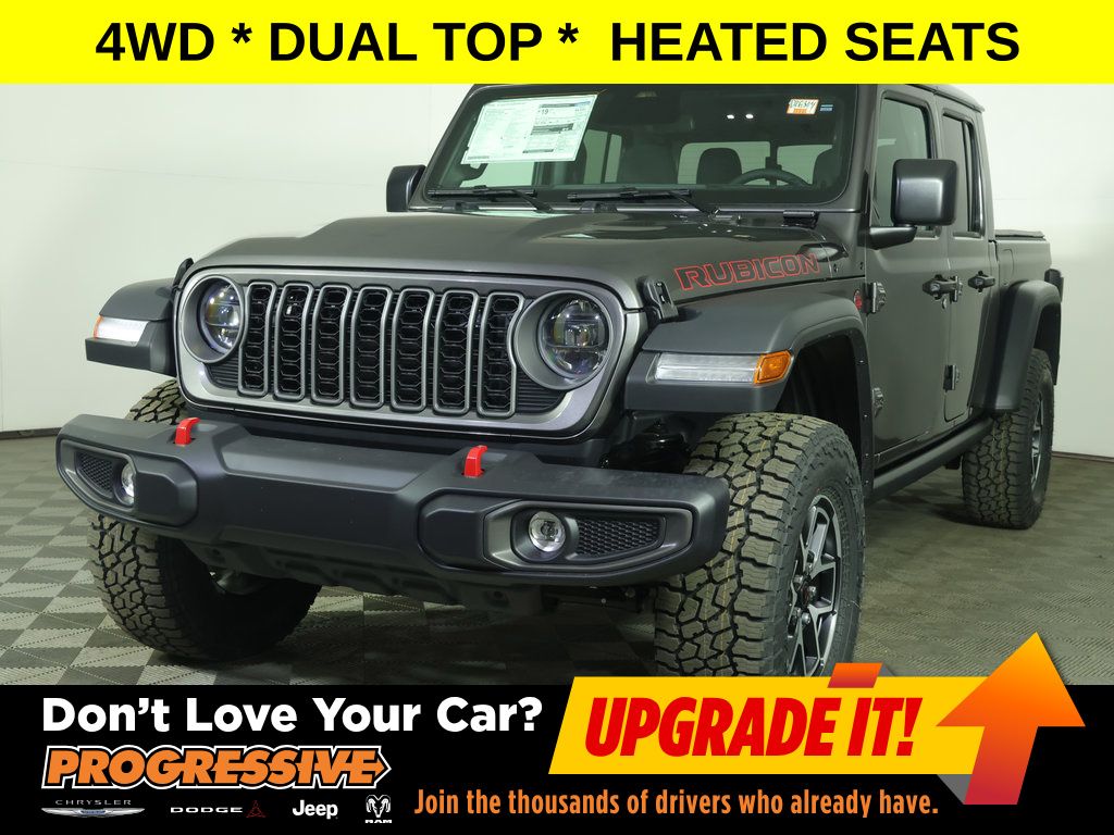 Granite Crystal Metallic Clearcoat 2026 Jeep Gladiator Rubicon 4WD 8-Speed Automatic 3.6L V6 24V VVT ** Adaptive Cruise Control, ** All-Wheel Drive, ** Alloy Wheels / Premium Wheels, ** Apple CarPlay/Android Auto, ** Backup Camera, ** Cruise Control, ** Four-Wheel Drive / 4X4, ** Heated Seats, ** Heated Steering Wheel, ** Keyless Entry, ** Keyless Start, ** Premium Sound System / Premium Audio, ** Remote Start, ** Satellite Radio, ** Stability Control, ** Steering Wheel Controls, ** Tow Hitch / Trailer Hitch, ** USB Port, ** WiFi Hotspot, 12.3" Touchscreen Display, 4-Wheel Disc Brakes, 4G LTE Wi-Fi Hot Spot, 8 Speakers, ABS brakes, Air Conditioning, Alexa Built-in, AM/FM radio: SiriusXM with 360L, Apple CarPlay/Android Auto, Automatic temperature control, Brake assist, Cloth Low-Back Bucket Seats, Compass, Connectivity - US/Canada, Convenience Group, Delay-off headlights, Driver vanity mirror, Dual front impact airbags, Dual front side impact airbags, Electronic Stability Control, Emergency communication system: Jeep Connect, Freedom Panel Storage Bag, Front Bucket Seats, Front dual zone A/C, Front fog lights, Front reading lights, Fully automatic headlights, Google Android Auto, Heated door mirrors, Heated Front Seats, Heated Steering Wheel, Illuminated entry, Integrated Center Stack Radio, Integrated roll-over protection, Low tire pressure warning, MOPAR All-Weather Slush Mats, MOPAR Soft Tri-Fold Tonneau Cover, MOPAR Spray in Bedliner, MOPAR Sunrider For Hardtop, Occupant sensing airbag, Outside temperature display, Panic alarm, Passenger vanity mirror, Performance Suspension, Power Dome Dual Vented Hood, Power door mirrors, Power windows, Quick Order Package 24R Rubicon, Radio: Uconnect 5 with 12.3" Display, Rear reading lights, Rear Sliding Window, Rear Window Defroster, Remote keyless entry, Remote Start, Security system, SiriusXM Radio Service, SiriusXM with 360L, Speed control, Split folding rear seat, Steel Power Dome Hood Package, Steering wheel mounted audio controls, Tachometer, Telescoping steering wheel, Tilt steering wheel, Traction control, Trip computer, Universal Garage Door Opener, USB Host Flip, Variably intermittent wipers, Voltmeter, Wheels: 17" x 7.5" Machined/Painted Black.