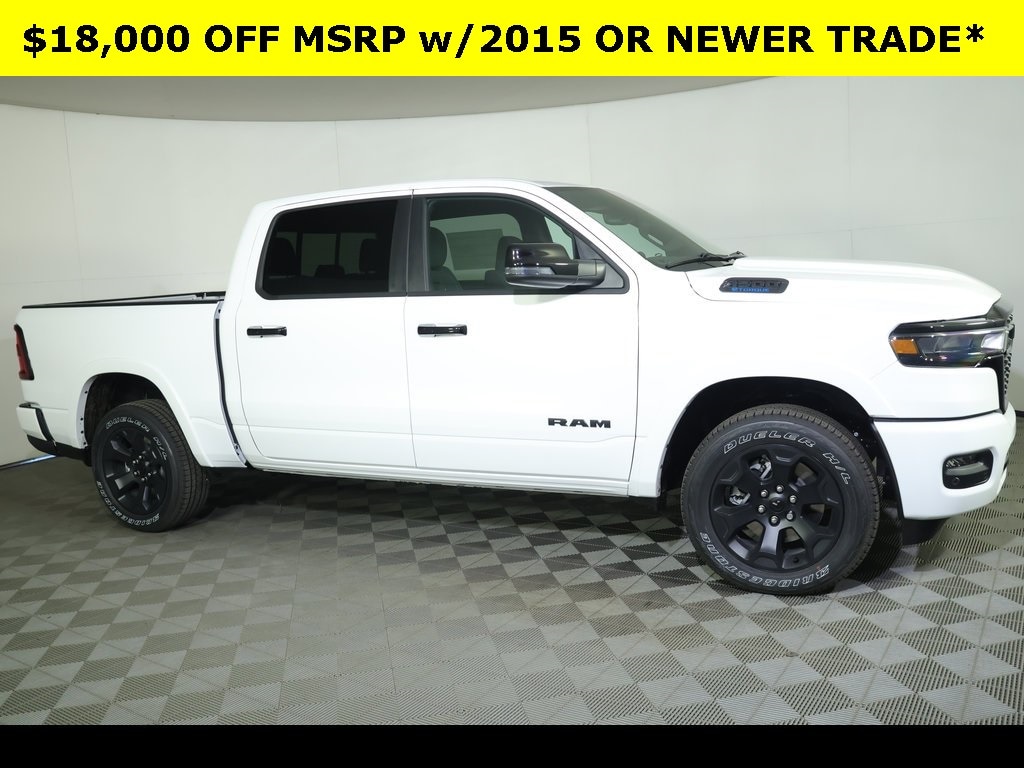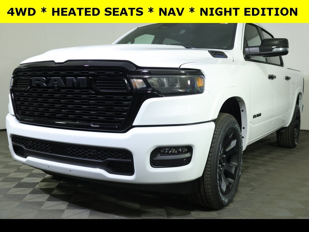 Bright White Clearcoat 2025 Ram 1500 Big Horn/Lone Star Night Edition 4WD 8-Speed Automatic 3.6L V6 24V VVT ** Adaptive Cruise Control, ** Alloy Wheels / Premium Wheels, ** Apple CarPlay/Android Auto, ** Automatic Emergency Braking, ** Backup Camera, ** Blind Spot Monitor, ** Cross Traffic Alert, ** Cruise Control, ** Heated Seats, ** Heated Steering Wheel, ** Keyless Entry, ** Keyless Start, ** Lane Departure Warning, ** Navigation System, ** Premium Sound System / Premium Audio, ** Rear Cross Traffic Alert, ** Remote Start, ** Satellite Radio, ** Stability Control, ** Steering Wheel Controls, ** Tow Hitch / Trailer Hitch, ** USB Port, ** WiFi Hotspot, ** All-Wheel Drive, ** Four-Wheel Drive / 4X4, 115V Auxiliary Power Outlet, 115V Auxiliary Rear Power Outlet, 12" Touchscreen Display, 2nd Row In Floor Storage Bins, 4-Wheel Disc Brakes, 400W Inverter, 4G LTE Wi-Fi Hot Spot, 9 Amplified Speakers w/Subwoofer, ABS brakes, Air Conditioning, Air Conditioning ATC w/Dual Zone Control, AM/FM radio, Anti-Spin Differential Rear Axle, Apple CarPlay/Android Auto, Auto High-beam Headlights, Auto Power-Folding Mirrors, Auto-Dimming Exterior Driver Mirror, Auto-Dimming Rear-View Mirror, Big Horn Badge, Big Horn Level 2 Equipment Group, Black Headlamp Bezels, Black Interior Accents, Body Color Front Bumper, Body Color Rear Bumper w/Step Pads, Brake assist, Bucket Seats, Compass, Configurable Drive Mode, Connected Travel & Traffic Services, Connectivity - US/Canada, Convex Wide-Angle Exterior Mirror Insert, Delay-off headlights, Deluxe Cloth Bucket Seats, Dual front impact airbags, Dual front side impact airbags, Electronic Stability Control, Exterior Mirrors Courtesy Lamps, Exterior Mirrors w/Heating Element, Exterior Mirrors w/Supplemental Signals, Front Center Armrest w/Storage, Front fog lights, Front reading lights, Front Seat Back Map Pockets, Front wheel independent suspension, Full Length Floor Console, Fully automatic headlights, Glove Box Lamp, Google Android Auto, GPS Antenna Input, GPS Navigation, Grille Black Surround Black Mesh, HD Radio, Heated door mirrors, Heated Front Seats, Heated Steering Wheel, Illuminated entry, Integrated Voice Command w/Bluetooth, Leather Wrapped Steering Wheel, LED Dome Lamp w/On/Off Switch, LED Footwell Lighting, Low tire pressure warning, Media Hub w/2 Charge Only USBs, MOPAR Front & Rear Rubber Floor Mats, Night Edition, Occupant sensing airbag, Outside temperature display, Overhead LED Lamps, Panic alarm, ParkView Rear Back-Up Camera, Passenger vanity mirror, Power Adjust 8-Way Driver Seat, Power Adjustable Pedals, Power door mirrors, Power windows, Premium Overhead Console, Quick Order Package 23Z Big Horn, Radio data system, Radio: Uconnect 5 Nav w/12.0" Display, Rear 60/40 Folding Seat, Rear Center Armrest, Rear Power Sliding Window, Rear seat center armrest, Rear step bumper, Rear Window Defroster, Remote keyless entry, Remote Tailgate Release, Security Alarm, SiriusXM w/360L, Speed control, Split folding rear seat, Steering Wheel Mounted Audio Controls, Sun Visors w/Illuminated Vanity Mirrors, Tachometer, Telescoping steering wheel, Tilt steering wheel, Traction control, Trip computer, Universal Garage Door Opener, USB Host Flip, Variably intermittent wipers, Voltmeter, Wheels: 20" x 9.0" Aluminum Painted Clad.