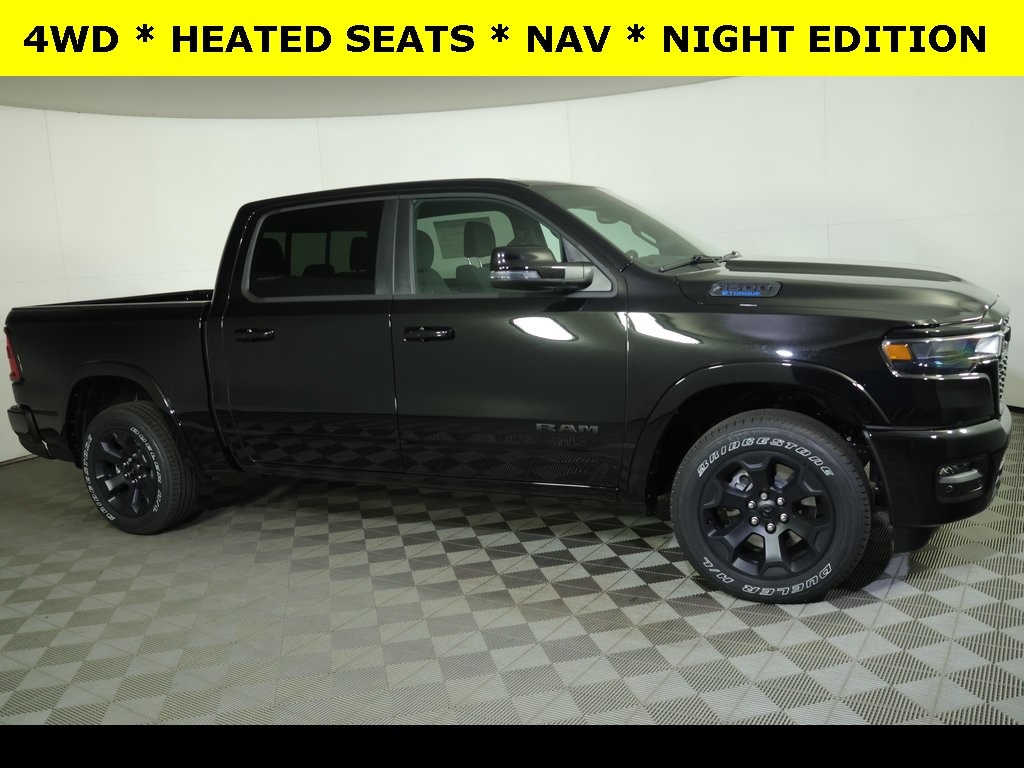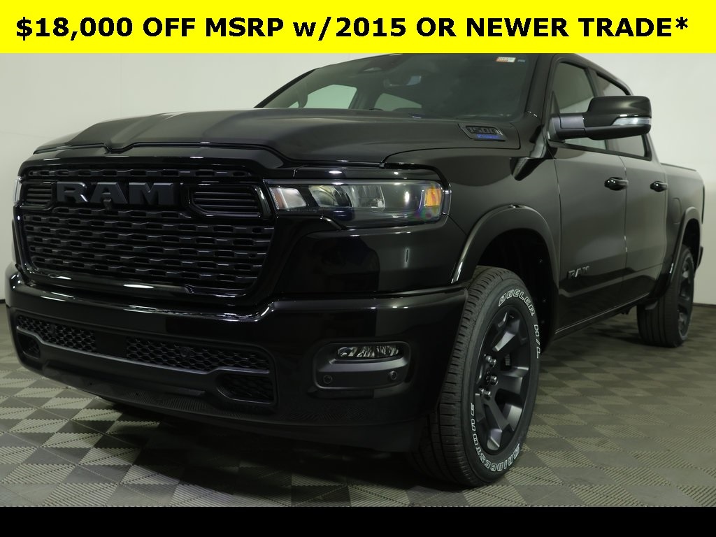 Diamond Black Crystal Pearlcoat 2025 Ram 1500 Big Horn/Lone Star Night Edition 4WD 8-Speed Automatic 3.6L V6 24V VVT ** Adaptive Cruise Control, ** Alloy Wheels / Premium Wheels, ** Apple CarPlay/Android Auto, ** Automatic Emergency Braking, ** Backup Camera, ** Blind Spot Monitor, ** Cross Traffic Alert, ** Cruise Control, ** Heated Seats, ** Heated Steering Wheel, ** Keyless Entry, ** Keyless Start, ** Lane Departure Warning, ** Navigation System, ** Premium Sound System / Premium Audio, ** Rear Cross Traffic Alert, ** Remote Start, ** Satellite Radio, ** Stability Control, ** Steering Wheel Controls, ** Tow Hitch / Trailer Hitch, ** USB Port, ** WiFi Hotspot, ** All-Wheel Drive, ** Four-Wheel Drive / 4X4, 115V Auxiliary Power Outlet, 115V Auxiliary Rear Power Outlet, 12" Touchscreen Display, 2nd Row In Floor Storage Bins, 3 Rear Seat Head Restraints, 4 Way Front Headrests, 4-Wheel Disc Brakes, 400W Inverter, 4G LTE Wi-Fi Hot Spot, 9 Amplified Speakers w/Subwoofer, ABS brakes, Air Conditioning, Air Conditioning ATC w/Dual Zone Control, AM/FM radio, Anti-Spin Differential Rear Axle, Apple CarPlay/Android Auto, Auto High-beam Headlights, Auto Power-Folding Mirrors, Auto-Dimming Exterior Driver Mirror, Auto-Dimming Rear-View Mirror, Big Horn Badge, Big Horn Level 2 Equipment Group, Black Headlamp Bezels, Black Interior Accents, Body Color Front Bumper, Body Color Rear Bumper w/Step Pads, Brake assist, Bucket Seats, Compass, Configurable Drive Mode, Connected Travel & Traffic Services, Connectivity - US/Canada, Convex Wide-Angle Exterior Mirror Insert, Delay-off headlights, Deluxe Cloth Bucket Seats, Dual front impact airbags, Dual front side impact airbags, Electronic Stability Control, Exterior Mirrors Courtesy Lamps, Exterior Mirrors w/Heating Element, Exterior Mirrors w/Supplemental Signals, Front Center Armrest w/Storage, Front fog lights, Front reading lights, Front Seat Back Map Pockets, Front wheel independent suspension, Full Length Floor Console, Fully automatic headlights, Glove Box Lamp, Google Android Auto, GPS Antenna Input, GPS Navigation, Grille Black Surround Black Mesh, HD Radio, Heated door mirrors, Heated Front Seats, Heated Steering Wheel, Illuminated entry, Integrated Voice Command w/Bluetooth, Leather Wrapped Steering Wheel, LED Dome Lamp w/On/Off Switch, LED Footwell Lighting, Low tire pressure warning, Manual Folding Exterior Mirrors, Media Hub w/2 Charge Only USBs, Night Edition, Occupant sensing airbag, Outside temperature display, Overhead console, Overhead LED Lamps, Panic alarm, ParkView Rear Back-Up Camera, Passenger vanity mirror, Power Adjust 8-Way Driver Seat, Power Adjustable Pedals, Power door mirrors, Power steering, Power windows, Premium Overhead Console, Quick Order Package 23Z Big Horn, Radio: Uconnect 5 Nav w/12.0" Display, Rear 60/40 Folding Seat, Rear Center Armrest, Rear Power Sliding Window, Rear seat center armrest, Rear step bumper, Rear Window Defroster, Remote keyless entry, Remote Tailgate Release, Security Alarm, SiriusXM w/360L, Speed control, Split folding rear seat, Steering Wheel Mounted Audio Controls, Sun Visors w/Illuminated Vanity Mirrors, Tachometer, Telescoping steering wheel, Tilt steering wheel, Traction control, Trip computer, Universal Garage Door Opener, USB Host Flip, Variably intermittent wipers, Voltmeter, Wheels: 20" x 9.0" Aluminum Painted Clad.