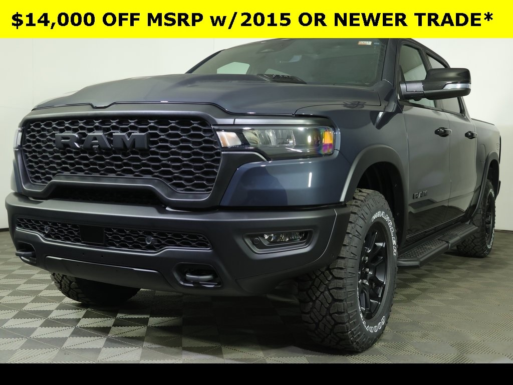 Forged Blue Metallic 2026 Ram 1500 Rebel 4WD 8-Speed Automatic 3.0L I6 ** Adaptive Cruise Control, ** Alloy Wheels / Premium Wheels, ** Apple CarPlay/Android Auto, ** Backup Camera, ** Blind Spot Monitor, ** Cooled Seats, ** Cross Traffic Alert, ** Cruise Control, ** Heated Seats, ** Heated Steering Wheel, ** Keyless Entry, ** Keyless Start, ** Lane Departure Warning, ** Leather Seats, ** Navigation System, ** Panoramic Roof / Sunroof, ** Premium Sound System / Premium Audio, ** Rear Cross Traffic Alert, ** Remote Start, ** Satellite Radio, ** Stability Control, ** Steering Wheel Controls, ** Sunroof/Moonroof, ** Tow Hitch / Trailer Hitch, ** USB Port, ** WiFi Hotspot, ** All-Wheel Drive, ** Four-Wheel Drive / 4X4, 115V Auxiliary Rear Power Outlet, 14.4" Touchscreen Display, 2-Door Passive Entry, Front Door Locks, 4-Wheel Disc Brakes, 4G LTE Wi-Fi Hot Spot, ABS brakes, Accent Color Tailgate Handle, Air Conditioning, Alloy wheels, AM/FM radio: SiriusXM with 360L, Apple CarPlay/Android Auto, Auto High-beam Headlights, Auto Power-Folding Mirrors, Auto-Dimming Exterior Driver Mirror, Auto-dimming Rear-View mirror, Automatic temperature control, Bed Utility Group, Brake assist, Bucket Seats, Compass, Connected Travel & Traffic Services, Connectivity - US/Canada, Convex Wide-Angle Exterior Mirror Insert, Delay-off headlights, Disassociated Touchscreen Display, Dome Dual LED Reading Lamp, Driver Seat Memory, Driver vanity mirror, Dual front impact airbags, Dual front side impact airbags, Dual Wireless Charging Pad, Dual-Pane Panoramic Sunroof, Electronic Stability Control, Exterior 115V AC Outlet, Exterior Mirrors Approach Lamps, Exterior Mirrors Courtesy Lamps, Exterior Mirrors w/Heating Element, Exterior Mirrors w/Memory, Exterior Mirrors w/Supplemental Signals, Front Center Armrest w/Storage, Front dual zone A/C, Front fog lights, Front Passenger Interactive Display, Front reading lights, Front Seat Back Map Pockets, Front wheel independent suspension, Full Length Upgraded Floor Console, Fully automatic headlights, G/T Decal, G/T Package, Garage door transmitter, Global Telematics Box Module (TBM), Google Android Auto, GPS Antenna Input, GPS Navigation, GT Interior Theme, harman/kardon 19 Speaker Premium Sound, HD Radio, Heated Front Seats, Heated Second Row Seats, Heated Steering Wheel, Illuminated entry, Integrated Center Stack Radio, Integrated Voice Command w/Bluetooth, Leather steering wheel, Leather Wrapped Shift Knob, Leather-Wrapped Steering Wheel, Leather/Vinyl Bucket Seats, Low tire pressure warning, Manual Folding Exterior Mirrors, Media Hub w/2 Charge Only USBs, MOPAR 4 Adjustable Cargo Tie-Down Hooks, Mopar Black Tubular Side Steps, MOPAR Bright Pedal Kit, Multi-Function Tailgate, Navigation System, Occupant sensing airbag, Off-Road Information Pages, Outside temperature display, Overhead console, Panic alarm, ParkView Rear Back-Up Camera, Passenger vanity mirror, Performance Pages, Power Adjust 8-Way Driver Seat, Power Adjust 8-Way Front Passenger Seat, Power Adjustable Pedals w/Memory, Power door mirrors, Power driver seat, Power Tailgate, Power windows, Proximity Approach/Departure Lamps, Quick Order Package 21W Rebel, Radio: Uconnect 5 Nav w/14.4" Display, Radio/Driver Seat/Mirrors/Pedals Memory, Rain Sensitive Windshield Wipers, RAM's Head Badge, Rear 60/40 Folding Seat, Rear 60/40 Folding Split Recline Seat, Rear seat center armrest, Rear step bumper, Rear Window Defroster, Rebel Level 2 Equipment Group, Remote keyless entry, Security Alarm, SiriusXM Radio Service, SiriusXM w/360L, Smartphone As A Key Capable, Speed control, Split folding rear seat, Steering wheel mounted audio controls, Steering Wheel Mounted Shift Control, Tachometer, Telescoping steering wheel, Tilt steering wheel, Traction control, Trip computer, Under Seat Lighting, USB Host Flip, Variably intermittent wipers, Ventilated Front Seats, Voltmeter, Wheels: 18" x 8.0" Painted Mid-Gloss Black.