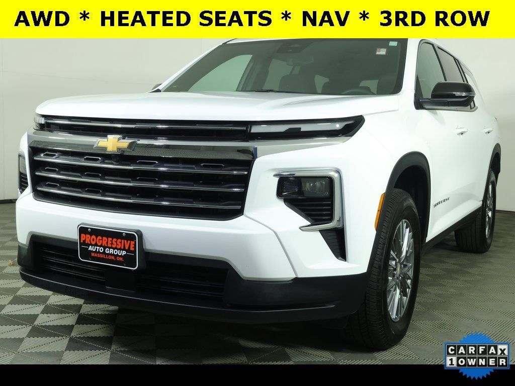 All Wheel Drive, ** Adaptive Cruise Control, ** Apple CarPlay/Android Auto, ** Alloy Wheels / Premium Wheels, ** Automatic Emergency Braking, ** Backup Camera, ** Blind Spot Monitor, ** Cross Traffic Alert, ** Cruise Control, ** Heated Seats, ** Heated Steering Wheel, ** Keyless Entry, ** Keyless Start, ** Lane Departure Warning, ** Navigation System, ** Premium Sound System / Premium Audio, ** Rear Cross Traffic Alert, ** Remote Start, ** Satellite Radio, ** Stability Control, ** Steering Wheel Controls, ** Third Row Seating / 3rd Row Seating, ** USB Port, ** WiFi Hotspot, ** All-Wheel Drive, ** Four-Wheel Drive / 4X4, 3rd row seats: split-bench, 4-Wheel Disc Brakes, 6-Speaker Audio System Feature, 8-Way Power Driver Seat Adjuster, ABS brakes, Air Conditioning, Alloy wheels, AM/FM radio: SiriusXM with 360L, Apple CarPlay/Android Auto, Auto High-beam Headlights, Automatic temperature control, Brake assist, Child-Seat-Sensing Airbag, Compass, Delay-off headlights, Driver vanity mirror, Dual front impact airbags, Dual front side impact airbags, Electronic Stability Control, Emergency communication system: OnStar, Four wheel independent suspension, Front Bucket Seats, Front Center Armrest, Front dual zone A/C, Front reading lights, Fully automatic headlights, Heated door mirrors, Heated front seats, Heated steering wheel, Illuminated entry, Low tire pressure warning, Navigation System, Occupant sensing airbag, Outside temperature display, Overhead console, Panic alarm, Passenger vanity mirror, Power door mirrors, Power driver seat, Power Liftgate, Power windows, Preferred Equipment Group 2LT, Premium Cloth Seat Trim, Radio: Audio System w/17.7 Diagonal Display, Rear air conditioning, Rear reading lights, Rear window defroster, Rear window wiper, Remote keyless entry, Security system, Speed control, Speed-sensing steering, Steering wheel mounted audio controls, Tachometer, Telescoping steering wheel, Tilt steering wheel, Traction control, Trip computer, Turn signal indicator mirrors, Variably intermittent wipers, Voltmeter, Wheels: 18 Grazen Metallic Machined-Face Aluminum. The listed retail price is available to all customers. Additional terms and conditions may apply. All financing is subject to credit approval and lender qualification. Please contact the dealership for complete details. You'll be happy you chose Progressive Auto Group in MASSILLON for this 2025 Chevrolet Traverse.CARFAX One-Owner. Clean CARFAX.This vehicle has been thoroughly inspected and serviced by factory trained technicians. Many of our customers are looking for inventory with options such as Sunroof, Moonroof, Leather Seats, Trailer Hitch, Tow Package.
