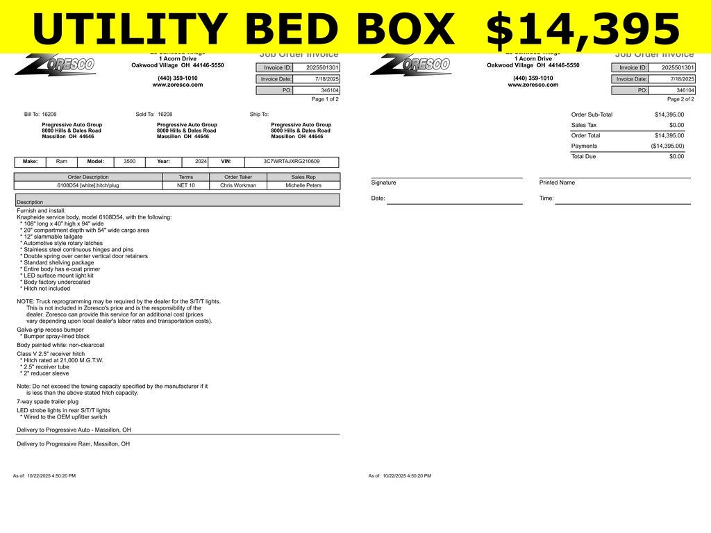 The listed retail price is available to all customers. Additional terms and conditions may apply. Sale or discounted pricing is valid exclusively when the full purchase amount is financed through the dealership's preferred lending institution. All financing is subject to credit approval and lender qualification. Please contact the dealership for complete details. You'll be happy you chose Progressive Auto Group in MASSILLON for this 2024 Ram 3500.